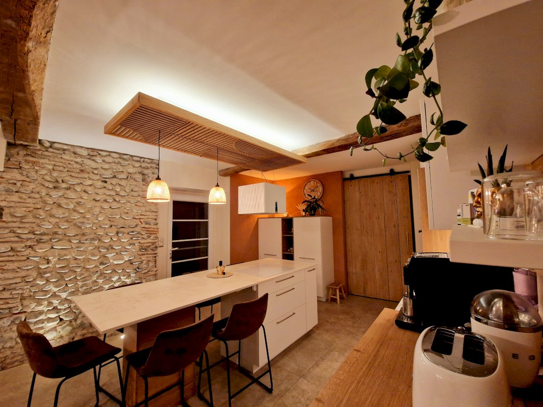 - Au rez-de-chaussée une cuisine neuve et équipée, un double séjour, WC, arrière cuisine, atelier et buanderie.