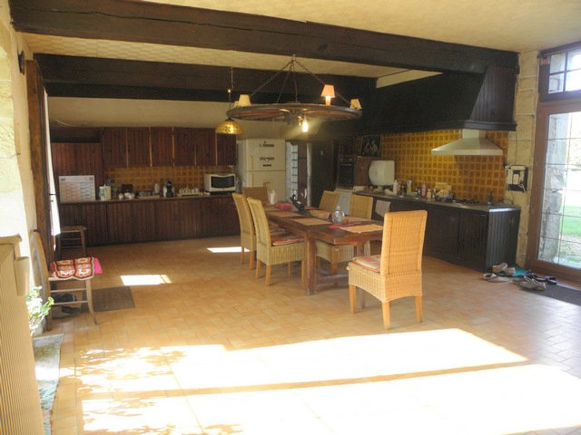 Grande salle commune de 54M² cheminée et vieil évier en pierre. Poutres d'origine