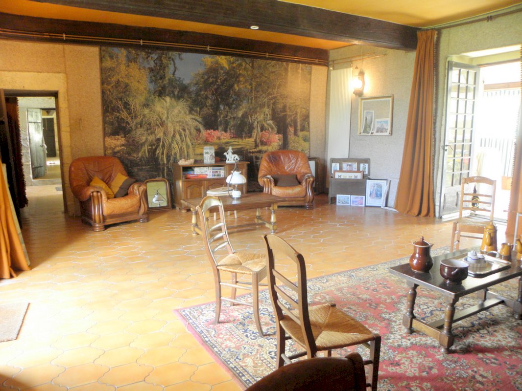 Grand séjour de 42M² avec poutres et cheminée avec Insert fonctionnel en pierre d'origine donnant sur une véranda chauffée de 16,50M².