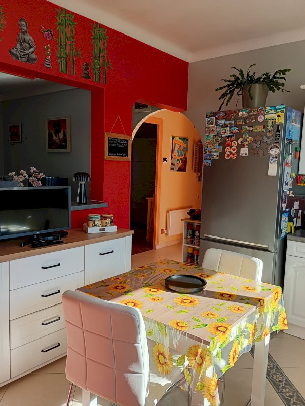 Cuisine entièrement équipée ouverte sur séjour salon. arrière cuisine.avec cumulus Ariston plat. 2 chambres avec placards. Sol parquet, 2 salle de bain avec baignoire, douche pour handicapé, lavabo sur meuble tout est neuf. WC neuf. Couloir desservant les pièces. Chauffage par pompe à chaleur RO, climatisation réversible, poêle à granulés. Murs isolés de l'intérieur, double flocon age dans les combles. VMC, tout à l'égout, volets électriques et solaires, porte blindée.