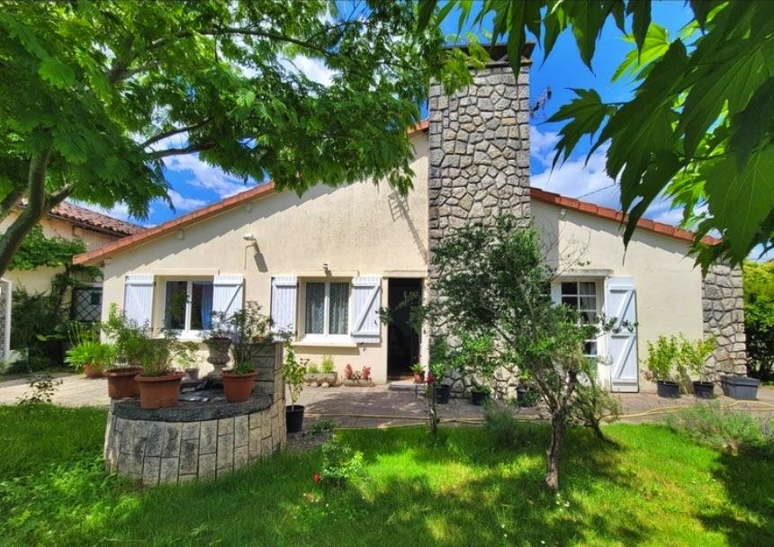 Maison de113 m², de plain-pied, sur terrain de 1230m² comprenant un grand séjour lumineux, une cuisine équipée, trois chambres, une buanderie, une salle d'eau et un WC indépendant. Chauffage central par pompe à chaleur (2 ans) sur radiateurs.