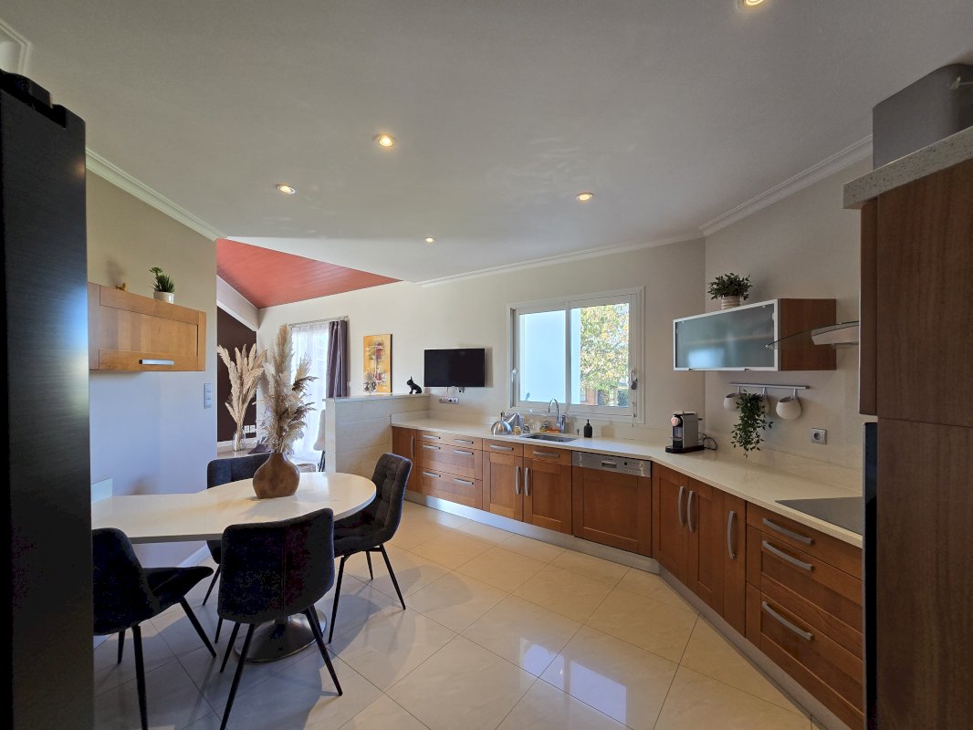 Dès l’entrée, la maison séduit par ses volumes généreux et sa luminosité. Le vaste salon / séjour de 46 m², chaleureux et authentique, s’articule autour d’un insert et d’un mur en pierres naturelles, créant une atmosphère à la fois raffinée et conviviale. La cuisine équipée en merisier massif, avec son plan de travail en Quartz Silestone, allie esthétique et fonctionnalité, idéale pour les amateurs de beaux matériaux.