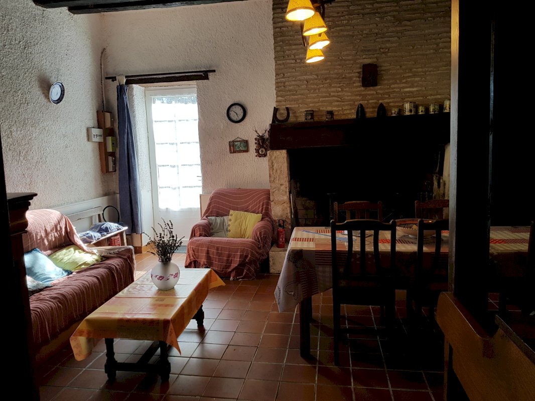 Salon/salle à manger avec cheminée fonctionnelle, cuisine séparée et équipée, salle d'eau, WC indépendant, et grande chambre. chauffage central au fioul.
