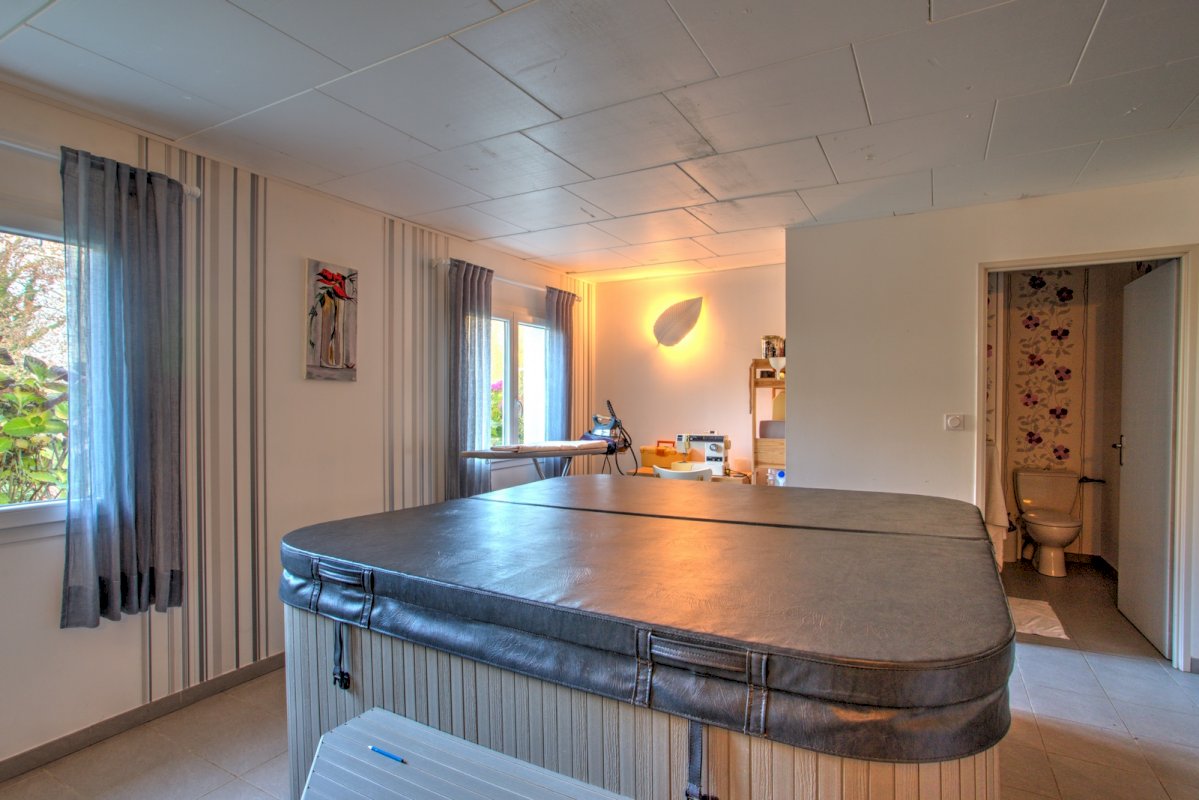 REZ DE JARDIN 110 M2 : GRANDE PIÈCE SPA AVEC JACUZZI 4 PERSONNES AVEC DOUCHE ET WC, CELLIER, BUANDERIE, CAVE ET DOUBLE GARAGE.