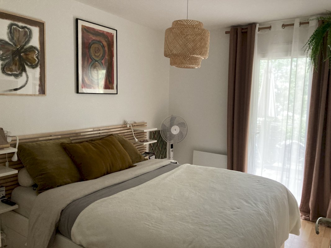 L'appartement comprend : 1 entrée avec grand placard de rangement, 1 salle de bain, 1 petite chambre avec 1 lit simple, 1 chambre avec lit 160x200 et grand placard de rangement avec porte fenêtre donnant sur la terrasse sans vis à vis, 1 belle pièce de vie avec salon et cuisine entièrement équipée avec grande baie vitrée donnant également sur la terrasse couverte de presque 20 m² entourée de verdure.