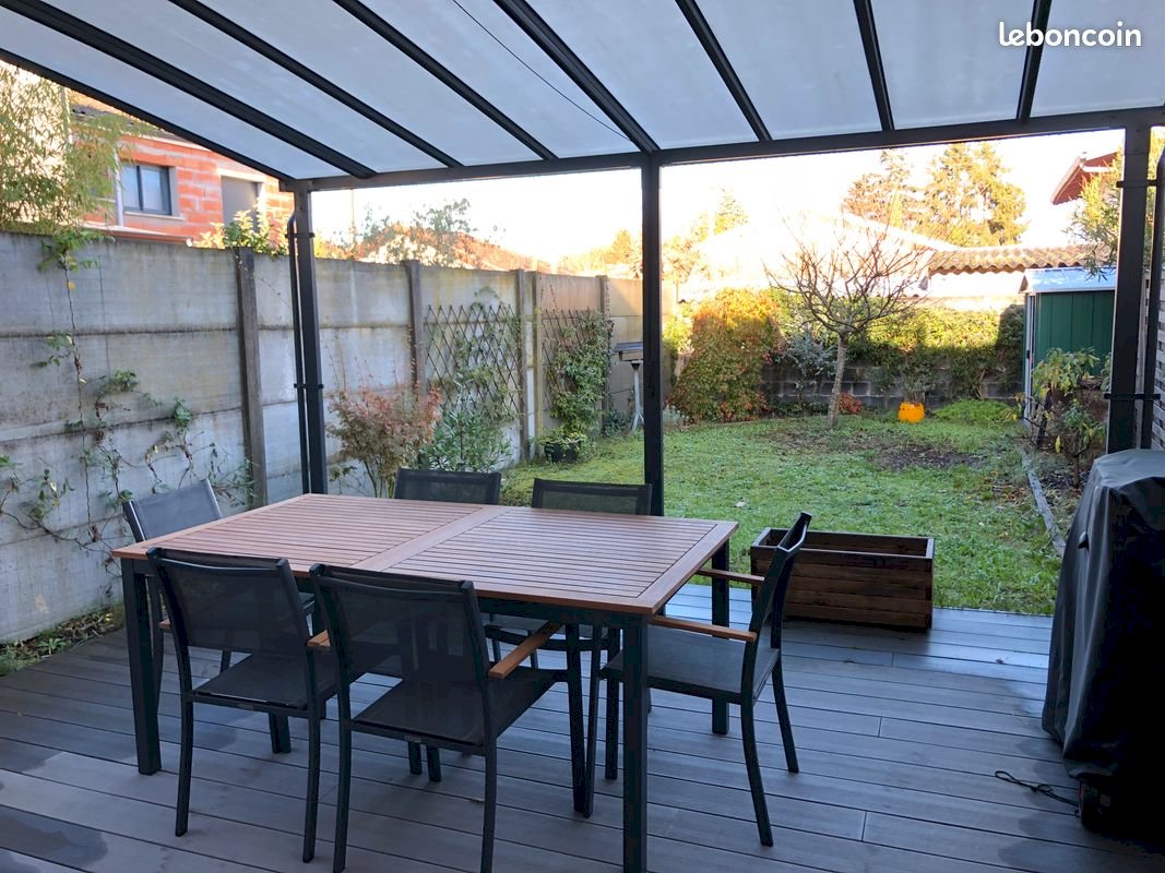 * Jardin d’environ 100 m², terrasse avec tonnelle, salon de jardin et cabanon