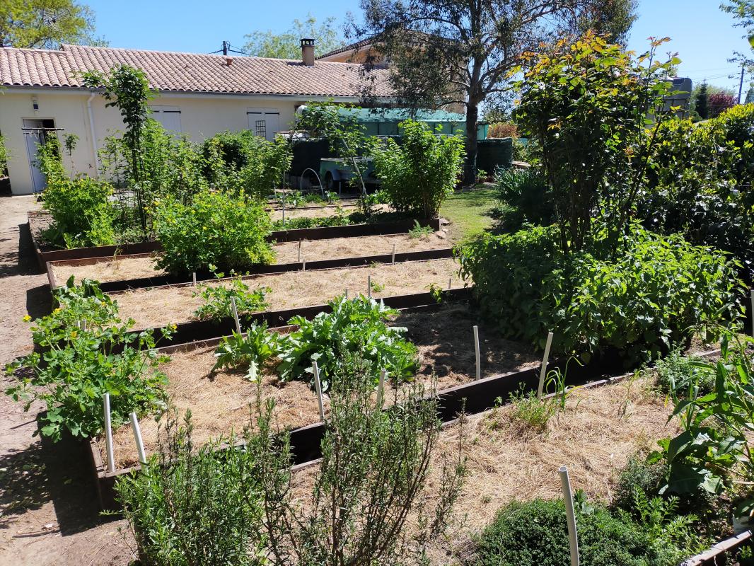 Une dizaine d'arbres fruitiers et 1 grand jardin potager aménagé avec des planches., nombreux arbustes et massifs divers.