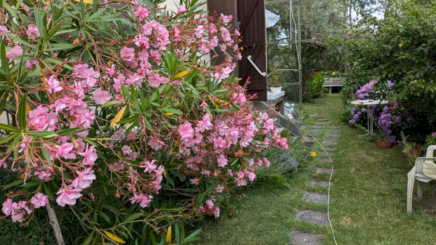 Le jardin paysagé et arboré invite à la détente près du bassin aux poissons.