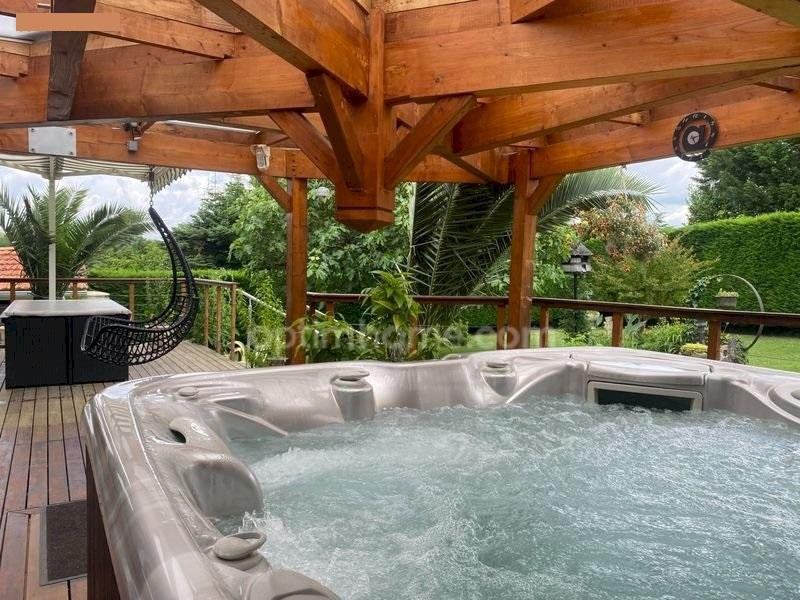 Grande terrasse en bois IPE (exotique) 60 m², jacuzzi américain 5 places, un bar extérieur, 2 barbecues. Très intimiste, à l'abri des regards, avec une partie couverte. Vous serez charmés !