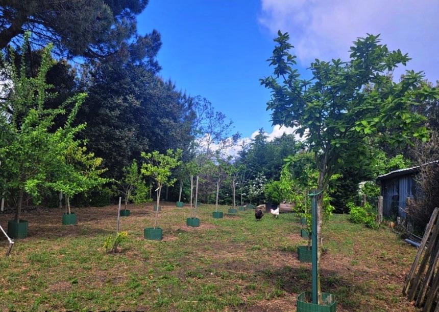 Jardin arboré et entretenu, serre, verger avec arbres fruitiers alimenté par un puits motorisé.