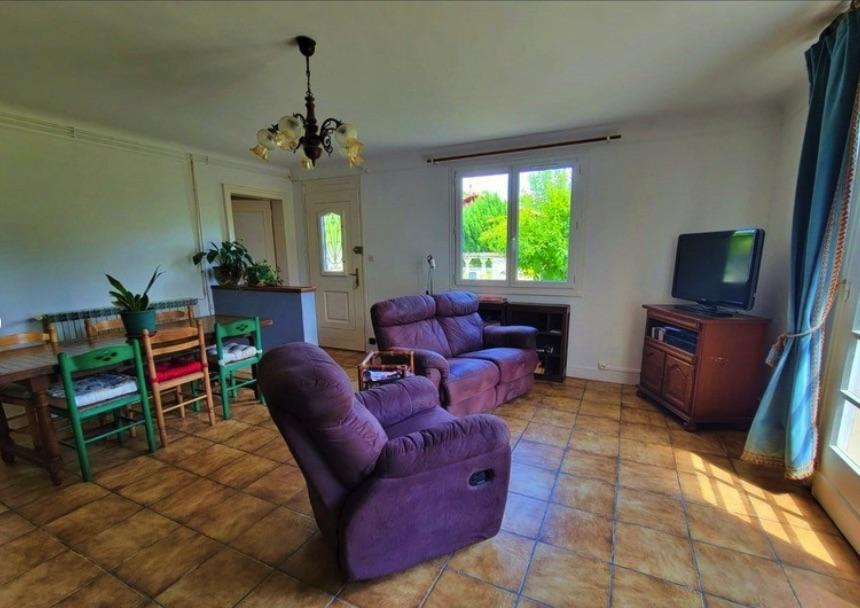 Maison de113 m², de plain-pied, sur terrain de 1230m² comprenant un grand séjour lumineux, une cuisine équipée, trois chambres, une buanderie, une salle d'eau et un WC indépendant. Chauffage central par pompe à chaleur (2 ans) sur radiateurs.