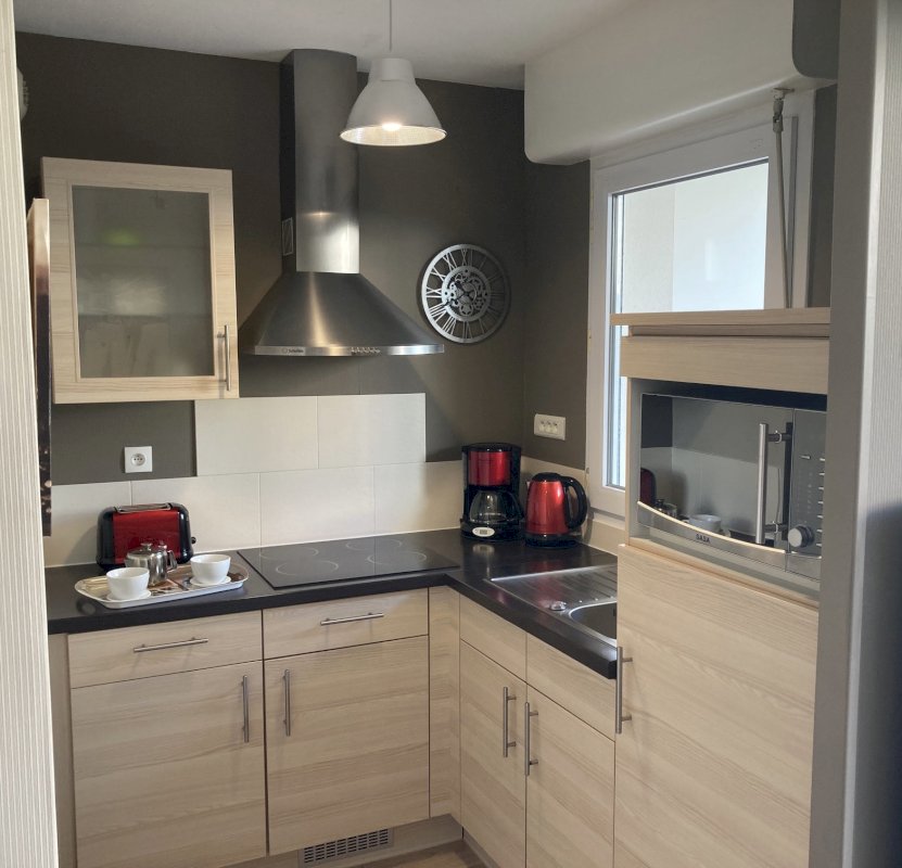 Cuisine équipée (plaque induction, hotte, réfrigérateur avec compartiment congélation). Placards de rangement (penderie et étagères).