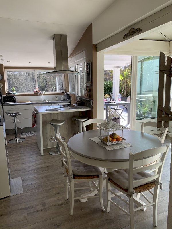 Cuisine intégrée avec bcp de rangements, frigo américain, four tradi, four micro onde, four vapeur, lave vaisselle, poêle à granulés, grand salon meublé de 47 m² attenant à la cuisine et le tout donnant sur la piscine, cheminée insert chazelles, 3 chambres meublées avec chacune sa salle de bain, dressing, bureau, 2 WC, 2 terrasses avec piscine au sel et dôme coulissant de 7 m sur 3,5, local sous parking 2 places pour bois ou autre de 12 m², cave scellier de 13 m², ponton et terrasse en bois donnant sur l'eau.