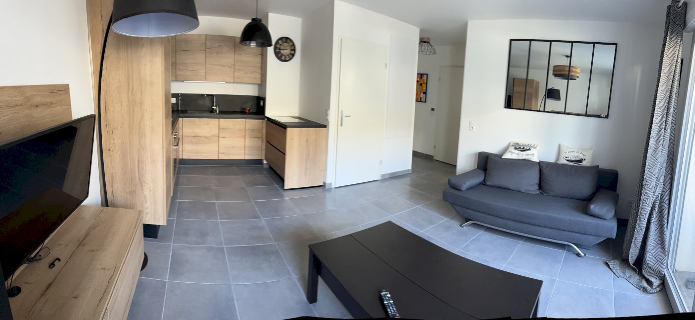 Une cuisine entièrement équipée ouverte sur le salon bien éclairé par une grand baie vitrée.