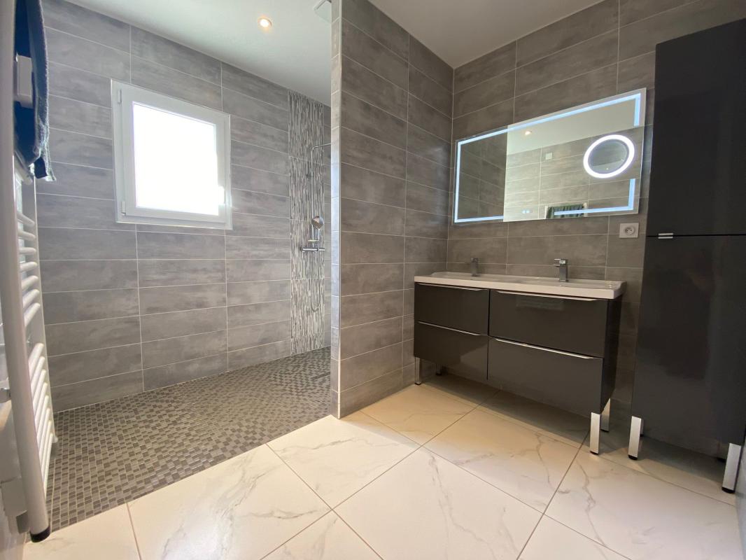 Elle est constituée d’une cuisine, entièrement équiper, un cellier, d’un gaz 4 feux, lave vaisselle, four, four microonde, haute aspirante et différentes, meuble de rangement, 3 chambres, d’une superbe grande salle de bain a double vasque, douche, carreler, jusqu’au plafond.