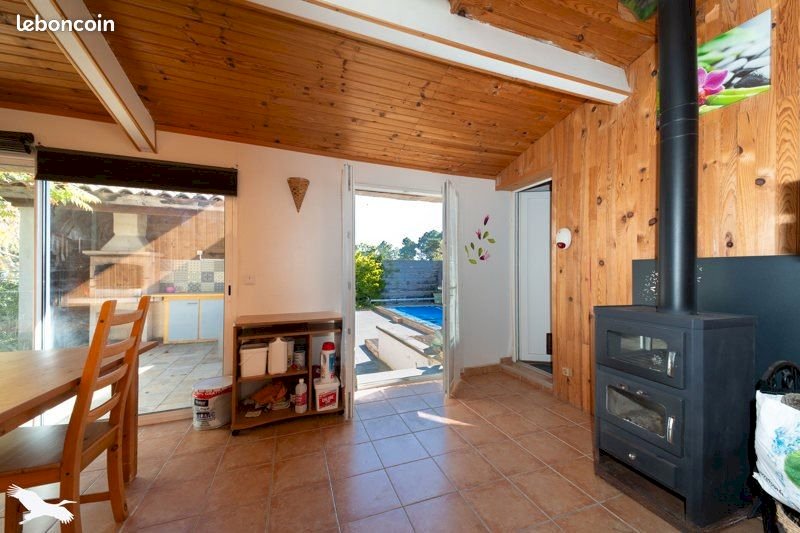 Une terrasse avec coin barbecue et un poolhouse qui est un petit studio indépendant.