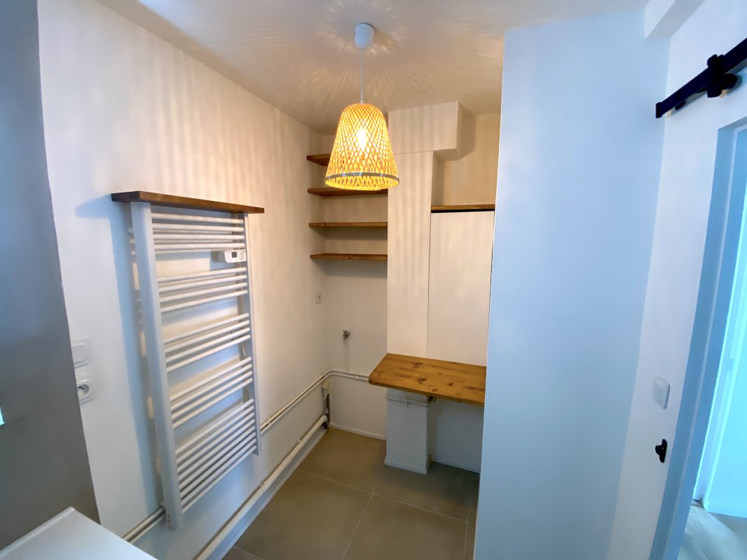 La salle d’eau, moderne, est également équipée (douche avec paroi vitrée, sèche serviette, meuble de rangement, miroir lumineux, étagères en bois massif, branchements pour lave-linge).