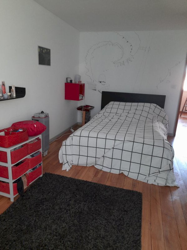 A l'étage, un appartement à visée locative est aménagé, avec une grande chambre, une petite, une cuisine/séjour et une salle de bain. De l'entrée, un escalier mène à un salon/séjour de 44 m² avec poutres apparentes et parquet de bois et 4 autres chambres très grandes ainsi qu'une salle d'eau/WC.