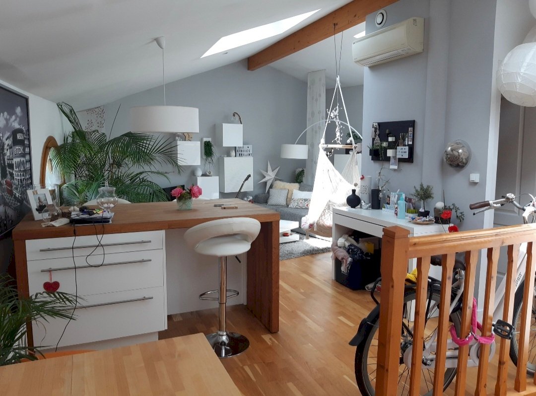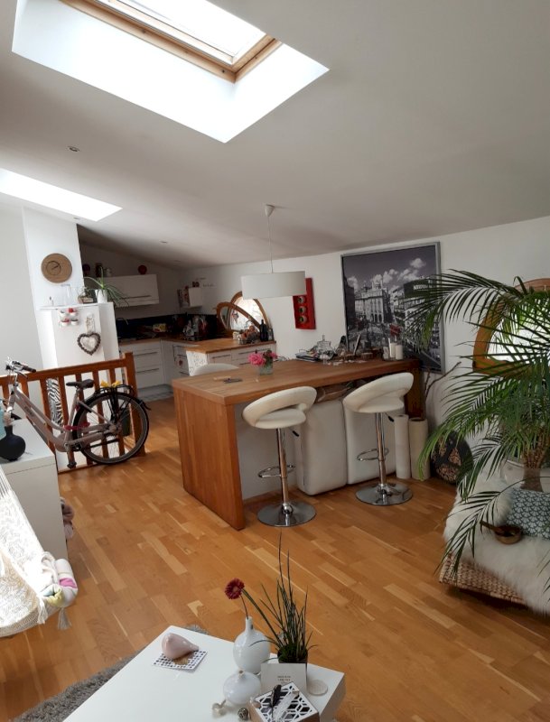 Se compose d'une chambre avec placard, une salle de bain avec douche à l'italienne et wc, un petit cellier et un salon ouvert sur cuisine américaine de 39 m².