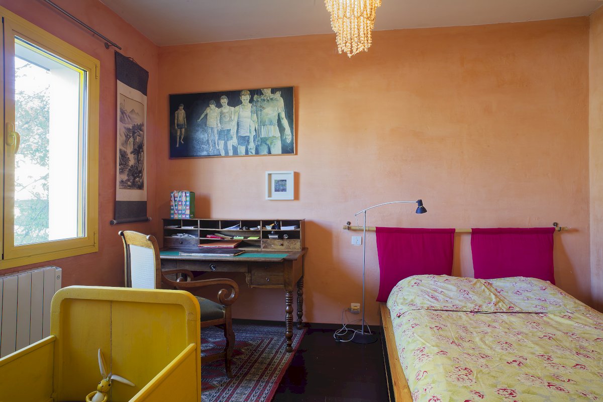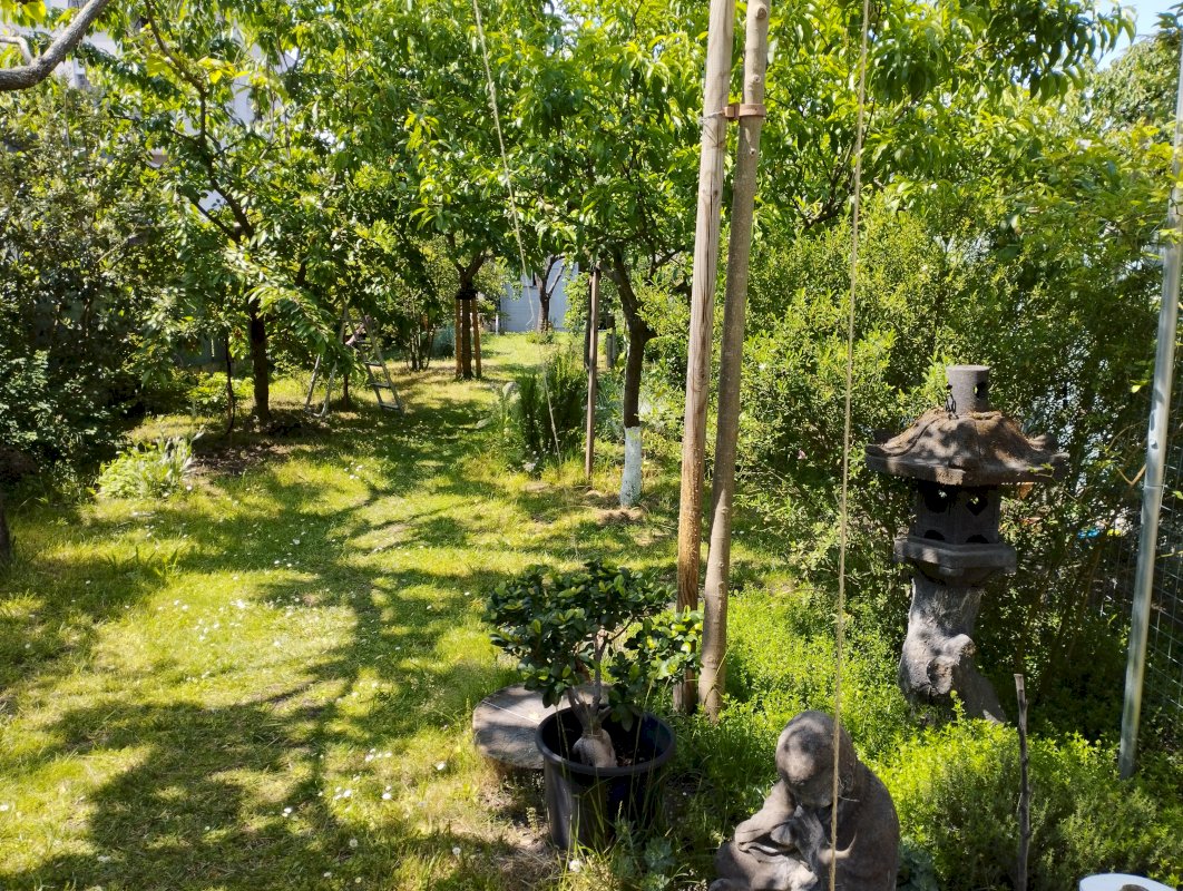 Les baies vitrées de la salle à manger s’ouvrent sur un véritable petit verger ombragé l’été et généreux (cerises, pèches, pommes, poires, raisins, feijoas, amandes, abricots) avec son cabanon pour ranger vélos et outils.