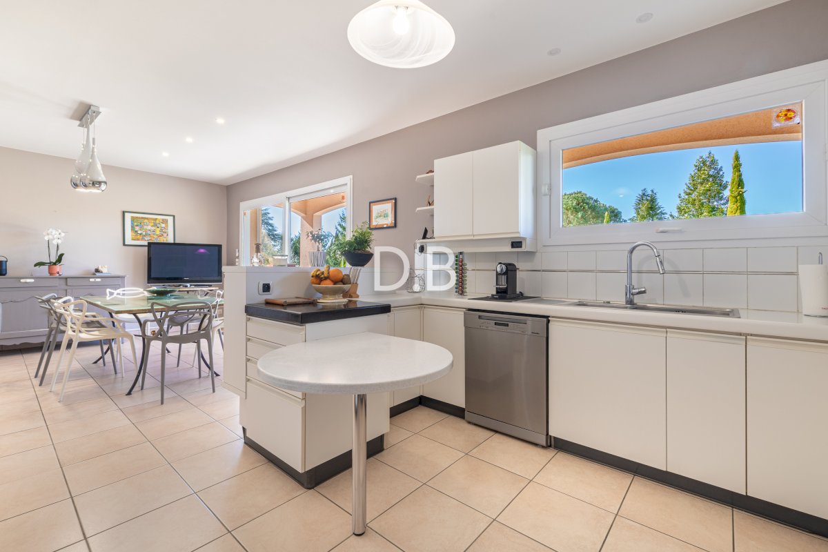 Cuisine spacieuse de 33 m², entièrement meublée et équipée, avec vue sur la piscine et accès à la terrasse, un cellier de 4 m² attenant à la cuisine.