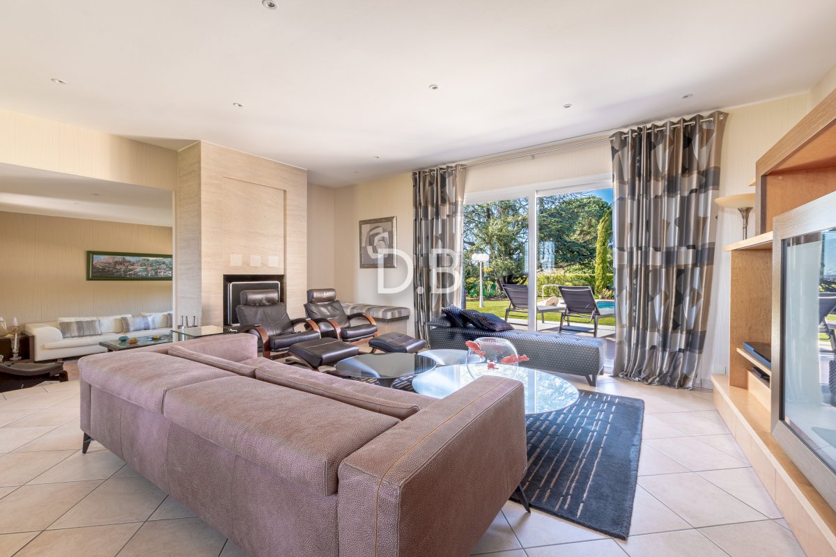 Grand salon-salle à manger de 54 m² avec cheminée à foyer ouvert en pierre marbrière, agrémenté d'une banquette en granit. Accès direct à une terrasse de 86 m² offrant une vue imprenable sur la piscine.