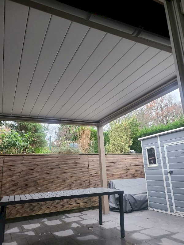 Terrasse entièrement carrelée avec pergola bioclimatique et petit terrain attenant.