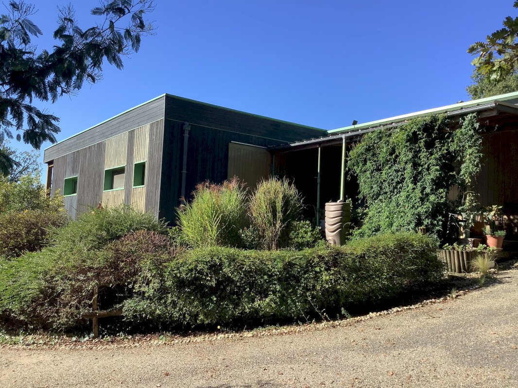 Maison en bois écologique et saine, construite entre 2013 et 2015, bardage en mélèze, sur pilotis, menuiseries en bois/alu avec volets roulants, grande baie vitré au sud avec terrasse couverte, dans un paysage préservé entouré des champs bios, vue sur la vallée de la Garonne et les Pyrénées, récupération d'eau de pluie, toiture terrasse, assainissement par filtres plantés.
