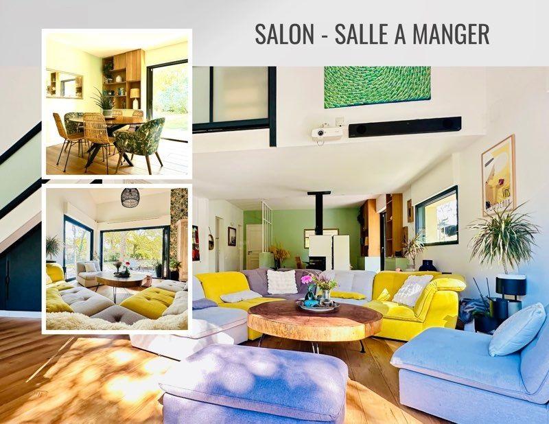 Vaste pièce de vie traversante (salon avec poêle à bois, coin cinéma, salle à manger, cuisine équipée) et suite parentale de 27 m² avec dressing et salle d’eau.