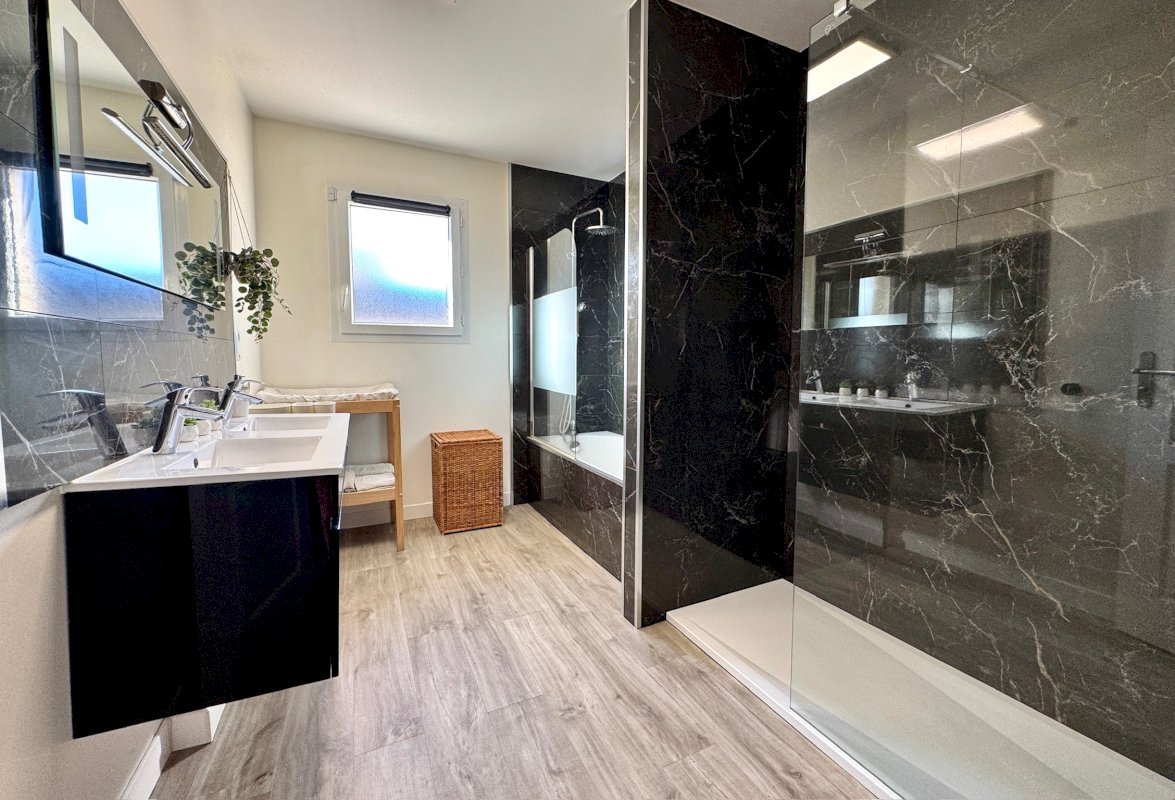 La maison dispose de 4 chambres dont une suite parentale, ainsi qu’une salle de bain complète avec douche à l’italienne, baignoire et double vasque, et un WC séparé.