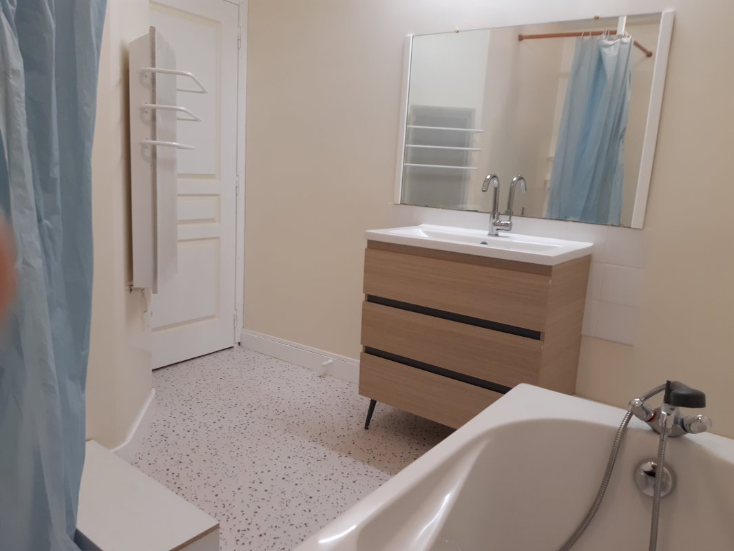 1° étage : palier de distribution 3m², chambre 17m², prise pour radiant électrique ; chambre 13m², prise pour radiant électrique; salle de bain entièrement refaite, meuble vasque 1m + baignoire 1,50 m + douche 1*0,8 m, grande glace, sans fenêtre mais bel éclairage, prise pour radiant électrique à sèche-serviette, ; wc séparés entièrement refait.