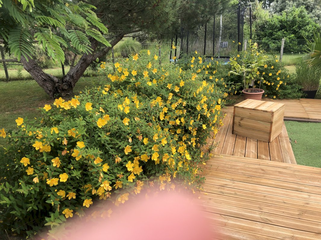Terrasse arborée avec différentes plantes et arbustes.