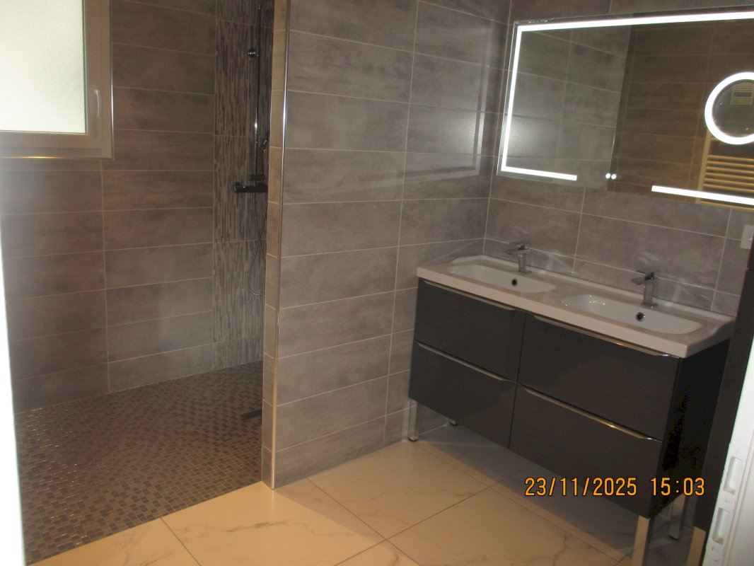 Elle est constituée d’une cuisine, entièrement équiper, un cellier, d’un gaz 4 feux, lave vaisselle, four, four microonde, haute aspirante et différentes, meuble de rangement, 3 chambres, d’une superbe grande salle de bain a double vasque, douche, carreler, jusqu’au plafond.
