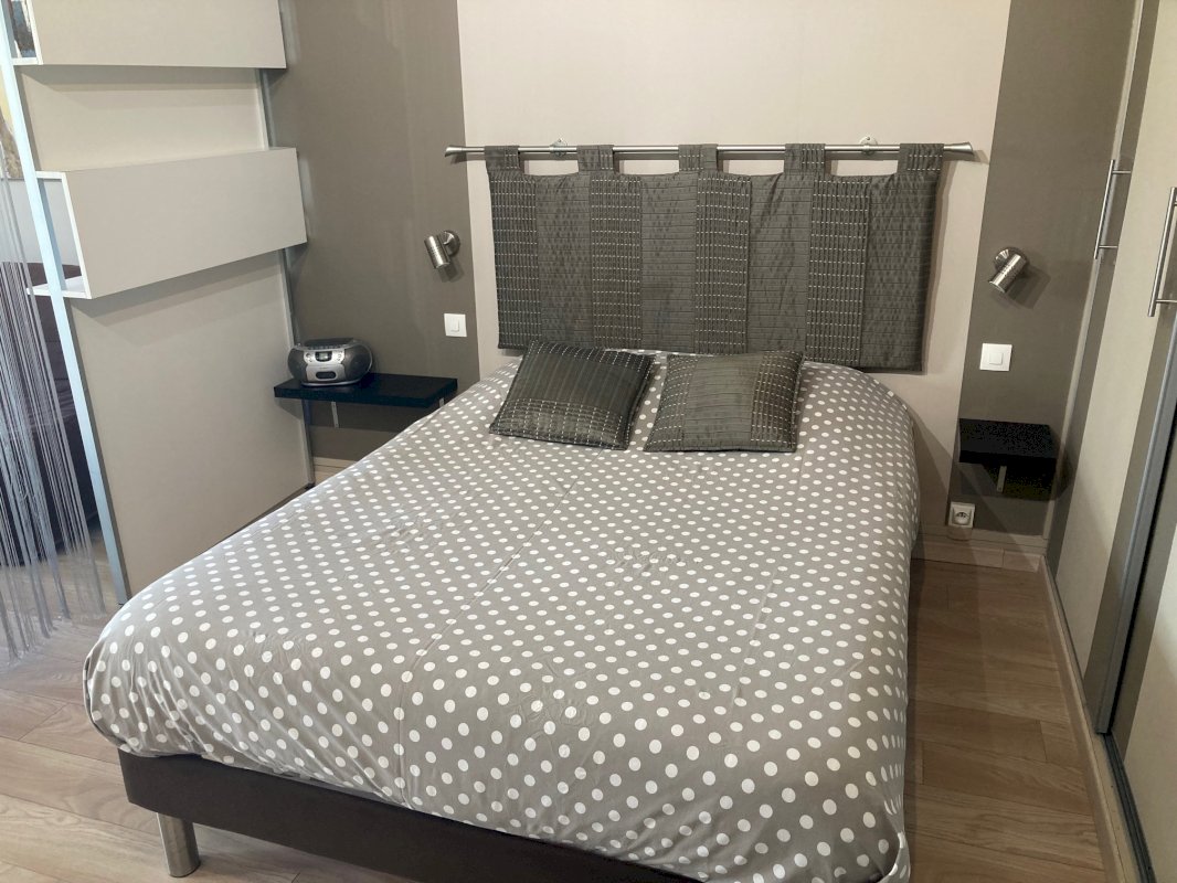 Cuisine équipée (plaque induction, hotte, réfrigérateur avec compartiment congélation). Placards de rangement (penderie et étagères).