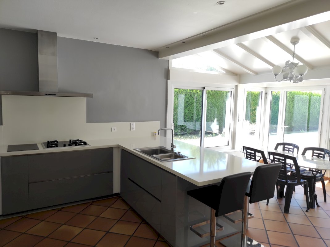 • En RDC, Hall d'entrée, wc, garage avec cave à vin, dressing, 2 chambres avec placards, salle de bain (douche). Séjour de 42m² avec cheminée, cuisine américaine de 28m² toute équipée.