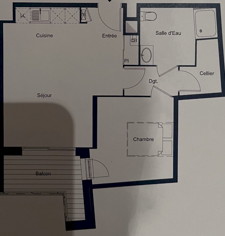 • 1 séjour lumineux avec cuisine ouverte donnant sur la terrasse de 6 m²