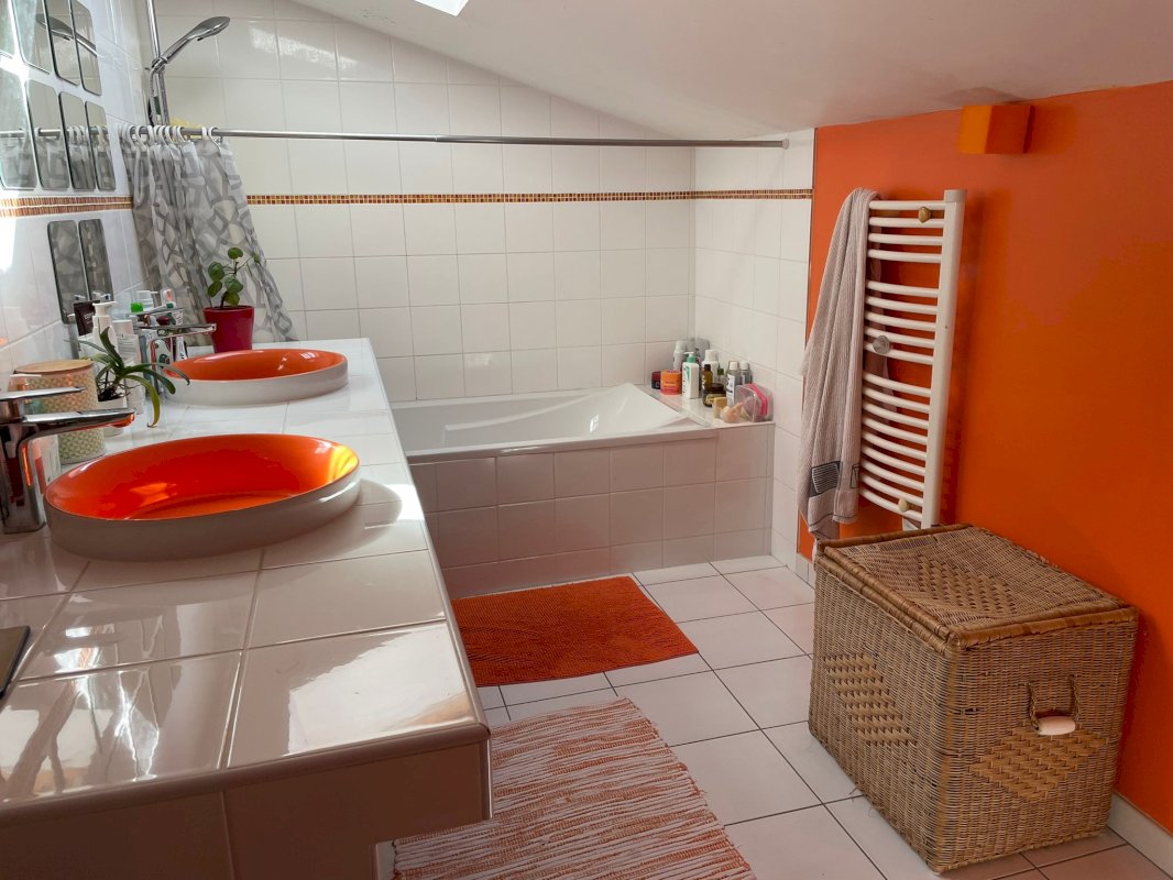 Un élégant escalier en métal et chêne mène à l’étage, où un palier lumineux sert de bureau, agrémenté d’un coin télé ou jeux vidéo. L’étage comprend quatre chambres, dont une suite parentale ouverte sur la piscine, avec douche à l’italienne, dressing, parquet et poutres apparentes. Une salle de bain supplémentaire, un WC séparé et un petit grenier complètent cet étage.