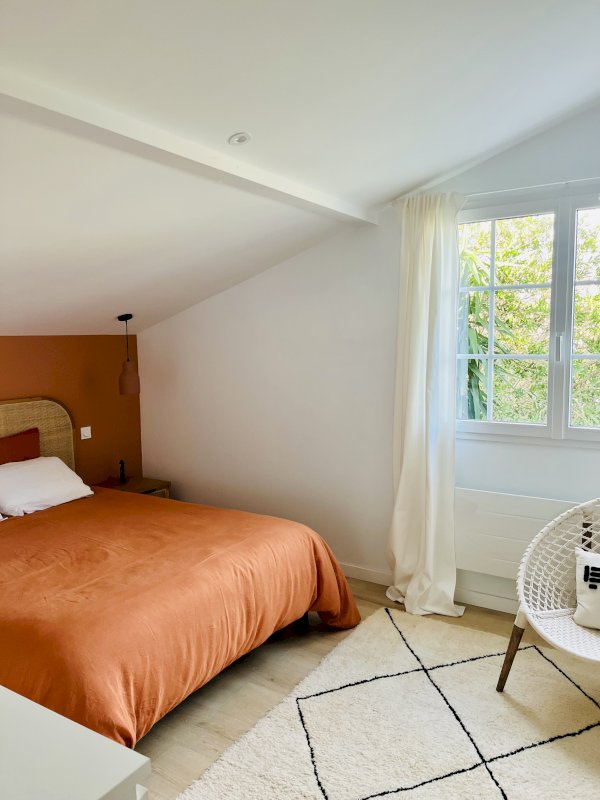 Dans une authentique maison basque de deux appartements, ce 5 pièces en rez de jardin développe une superficie de 126 m² au sol. Sans vis à vis.
