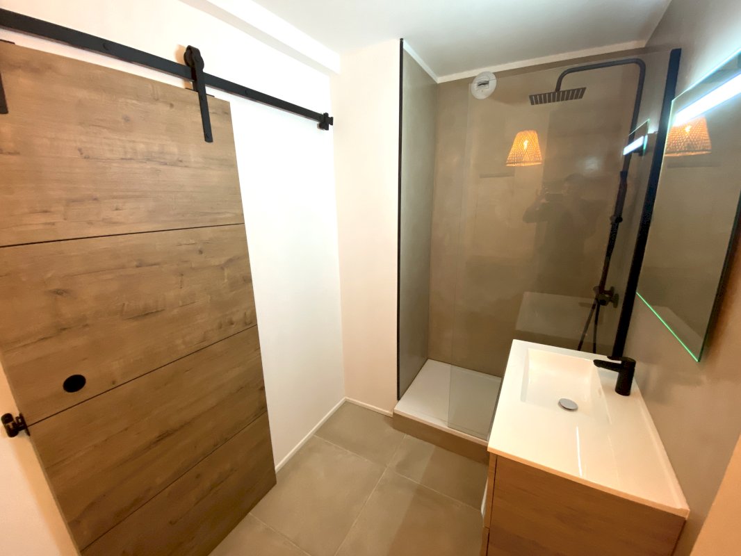 La salle d’eau, moderne, est également équipée (douche avec paroi vitrée, sèche serviette, meuble de rangement, miroir lumineux, étagères en bois massif, branchements pour lave-linge).