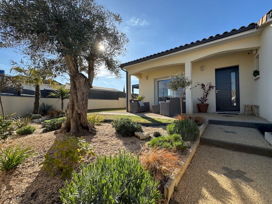 À l’extérieur, le terrain de 460 m² entièrement clôturé propose deux terrasses, dont une avec pergola bioclimatique (stores et éclairage intégrés), un patio en bois composite et un jardin paysagé.