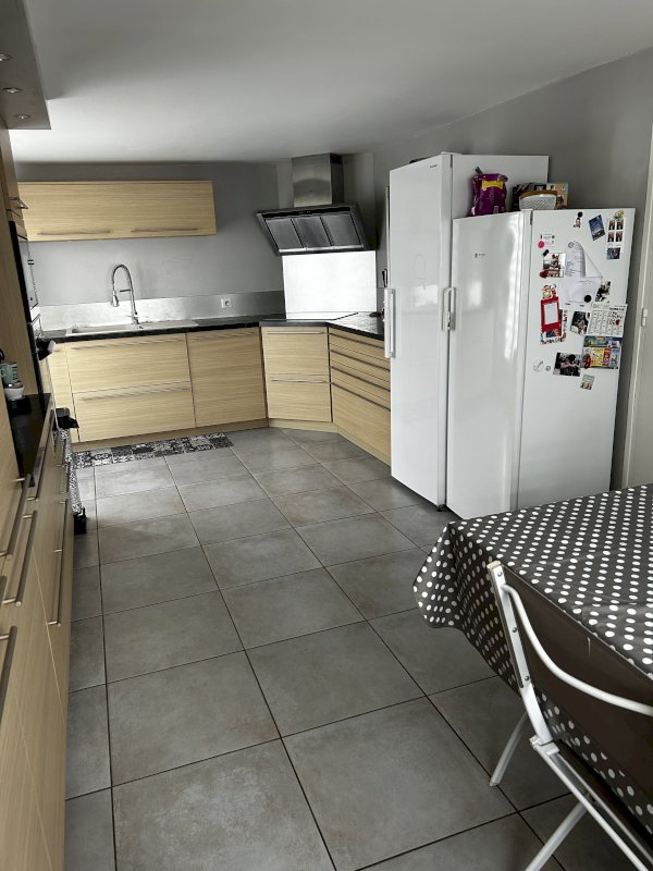 La cuisine indépendante de 20 m² équipée, nombreux rangements pratiques.