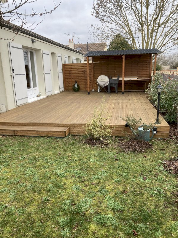 Terrain clos de 263 m², avec un chalet en bois de 10 m² avec un petit appentis et grande terrasse bois avec également un appentis.