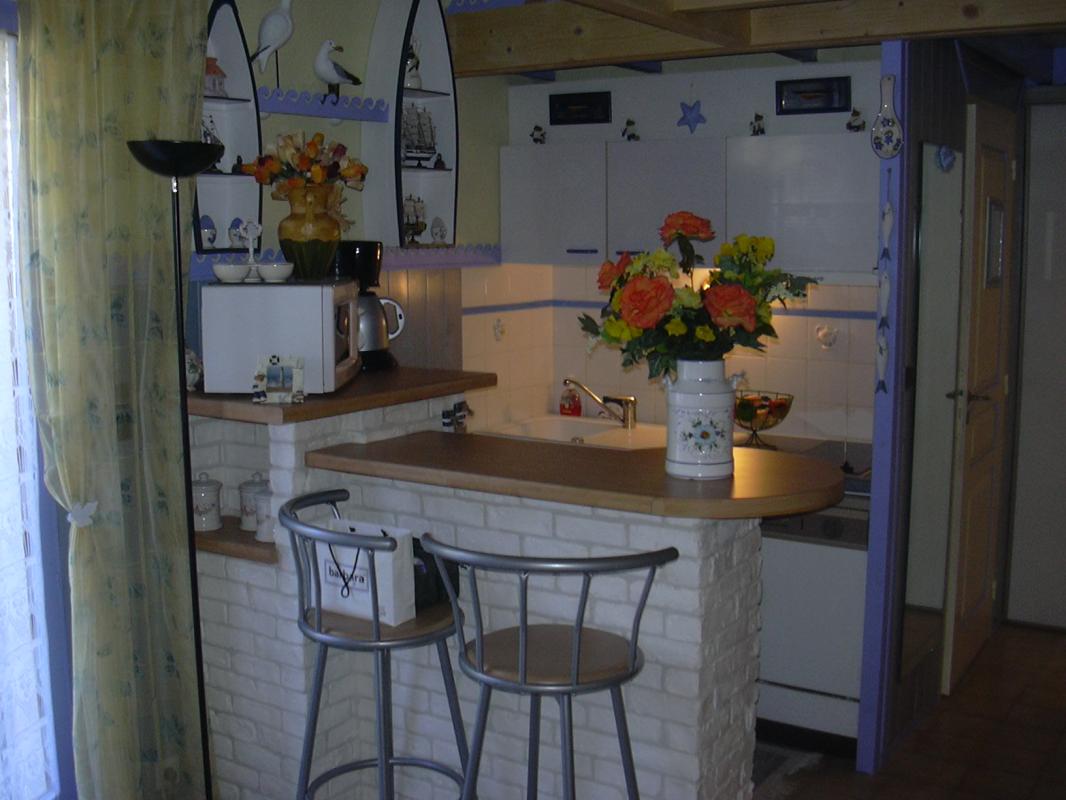 • Rez-de-chaussée : pièce de vie (meuble table vaisselier; meuble de coin; bar avec deux tabourets) coin kitchenette avec plaque vitro céramique (2 feux) hotte aspirante, meubles hauts et bas; dégagement avec placard, salle d'eau (douche ; meuble vasque; colonne et wc.