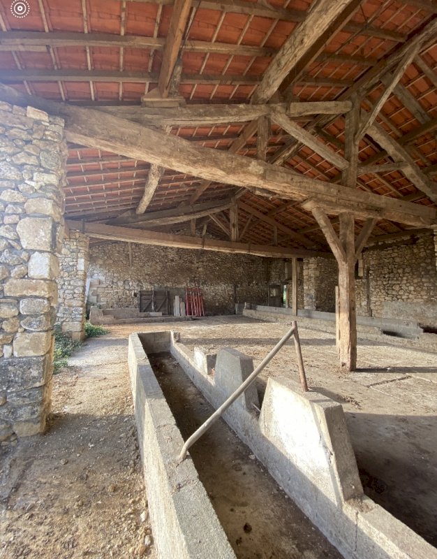 Complexe de bâtiments en pierres à rénover (possible 330m2 mini), situé dans un secteur infiniment calme et verdoyant, sur un terrain de 5600m2 dont un bosquet avec arbres centenaires, entre Brantôme et Ribérac, avec un accès complètement indépendant par un beau chemin arboré et comprenant :