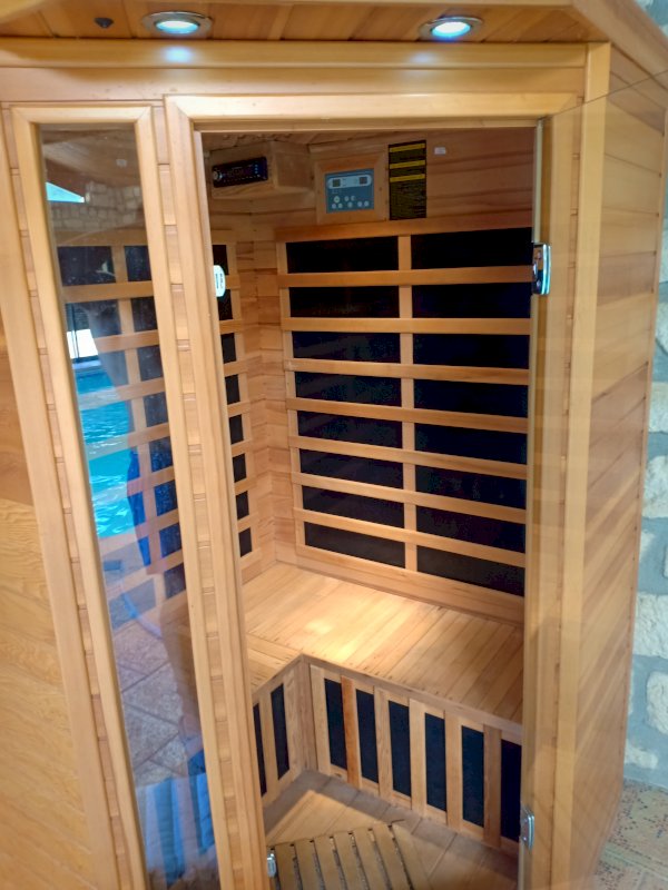 PISCINE: Salle de piscine chaufée par sol radiant, déshumidificateur. Piscine 30m3 climatisée. Revestiment en pierre a línterieur. Revestiment et poutres en bois au plafond. Carrelage au sol. Lucarnes motoriseés, Fenêtres au mur avec aveugles motoriseés. Armoire et cadres de control de la piscine.
