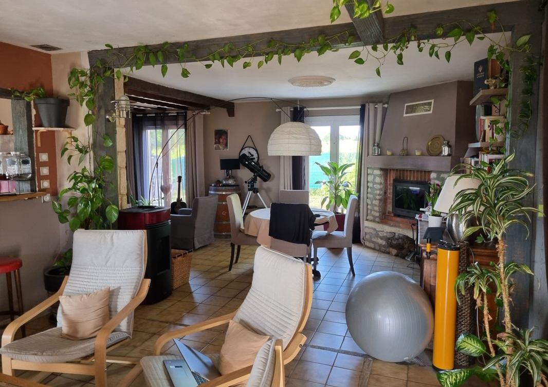 Elle se compose d'une belle pièce de vie d'environ 41 m² avec cheminée équipé d'un foyer fermé Deville 14 KW et poële à granulés, ouvert sur une cuisine équipée et aménagée de plus de 16 m².
