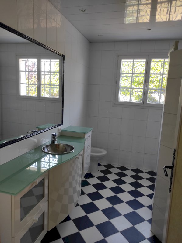 • En RDC, Hall d'entrée, wc, garage avec cave à vin, dressing, 2 chambres avec placards, salle de bain (douche). Séjour de 42m² avec cheminée, cuisine américaine de 28m² toute équipée.