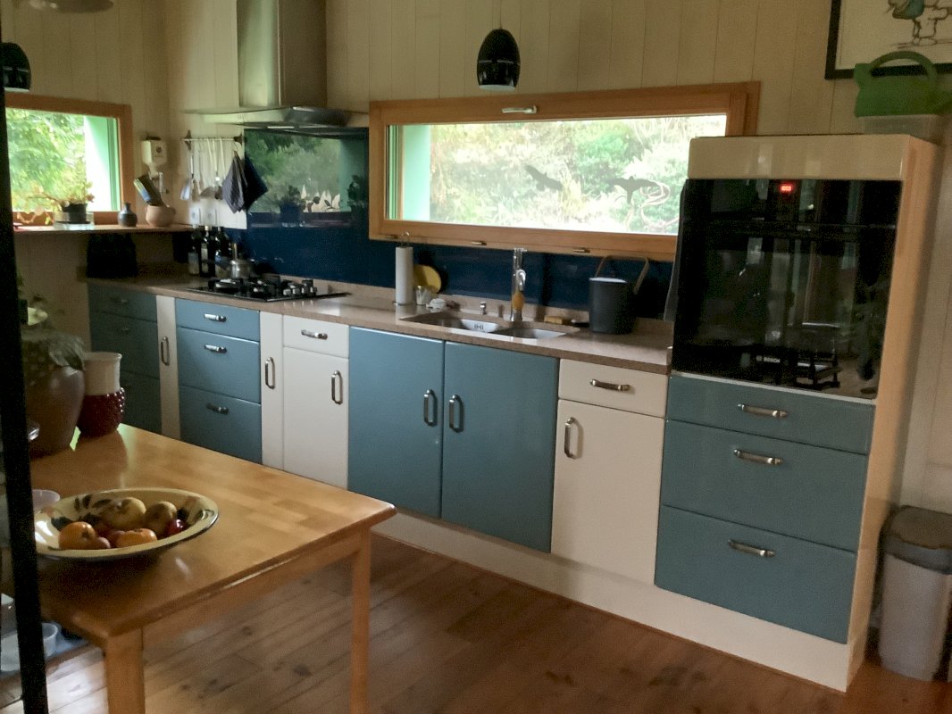 Grand séjour avec cuisine ouverte, arrière cuisine, deux grandes chambres, dressing, sas/entree, 2 salles de bains, 2 toilettes, chauffage par poêle à bûches (2 à 3 stères par an), terrain de 2800 m².