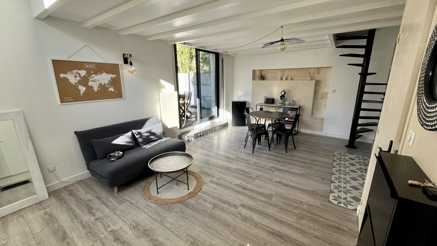 Nichée dans le fond d’une petite impasse à l’écart de toute route passante, cette échoppe en pierre en duplex de 49,35 m², avec son jardin de 30 m² plein ouest sans aucun vis-à-vis, vendue avec une place de stationnement couverte et un cellier dans un parking fermé, ravira les personnes en quête de calme et d’intimité, à proximité immédiate de toutes les commodités.