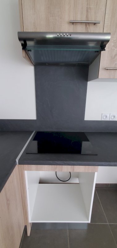 Cuisine ouverte donnant sur une pièce de vie lumineuse de 38m². La cuisine est aménagée et équipée avec une hotte et une plaque de cuisson.